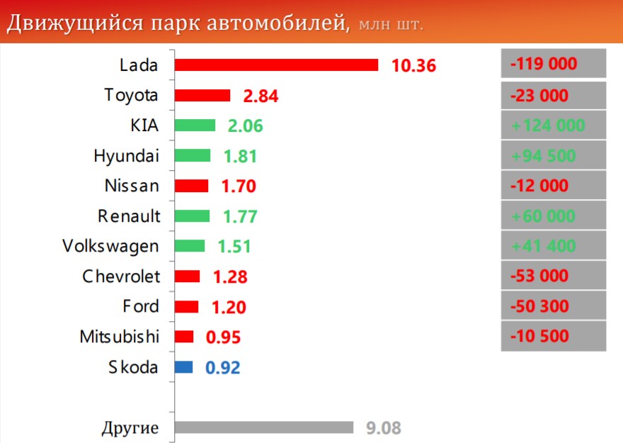 Lada остается основным брендом на российском авторынке. Более четверти движущегося парка страны приходится на автомобили этой марки. При этом доля Lada в движущемся автопарке неуклонно снижается. Темпы сокращения автомобилей этой марки превышают темпы пополнения за счет вновь проданных авто.